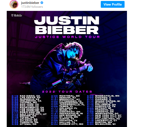Tras una espera de más de un año, el reconocido cantante pop Justin Bieber anunció las fechas de su nueva gira mundial, la cual lleva el nombre de su álbum más reciente, «Justice».