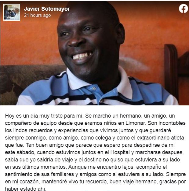 Por su parte, el recordista mundial de salto alto, Javier Sotomayor, escribió sentidas palabras en su cuenta de Facebook sobre el fallecimiento de quien reconociera como “un hermano”.