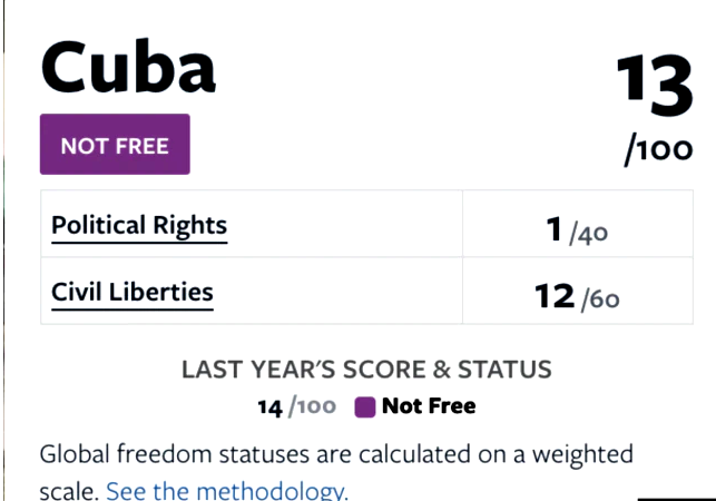 En las secciones sobre procesos electorales, pluralismo político y derechos de asociación, Freedom House le da a Cuba 0 puntos de un máximo de 4.